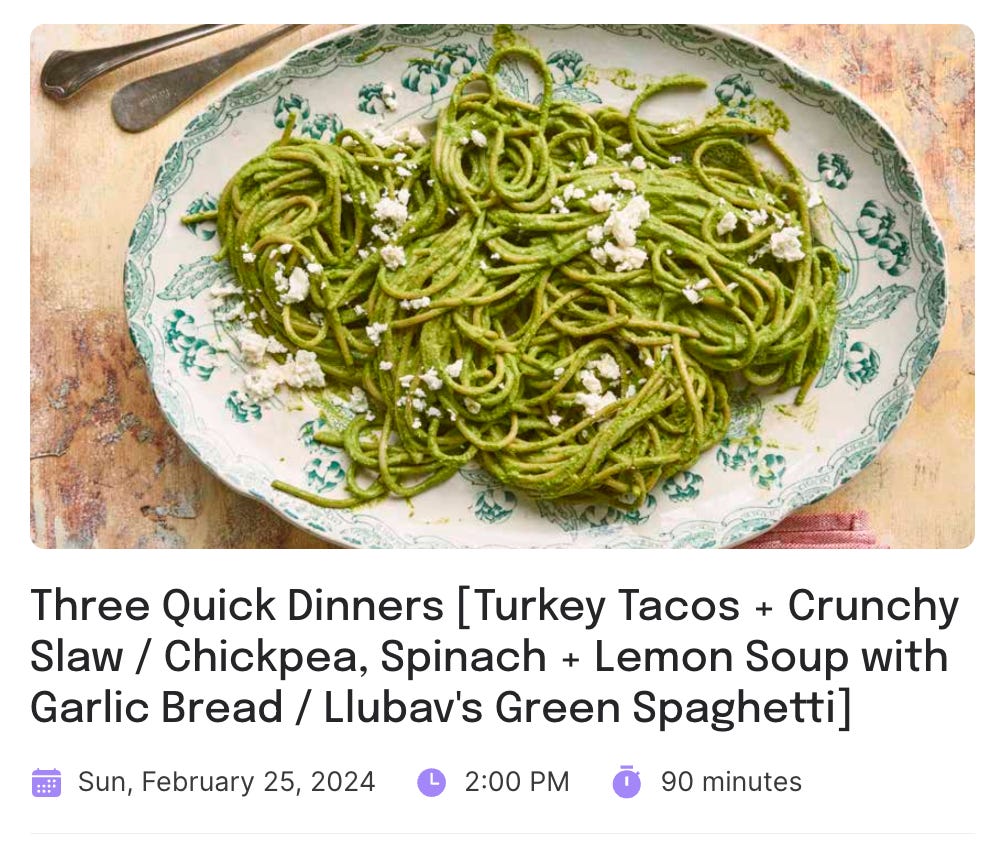 Here’s the official description: If you're in a dinner rut, join me for this helpful class where we'll make three of my favorite QUICK dinners (I'll make all three of them during the class if that tells you how fast they are). First up the easiest turkey tacos (basically ground turkey + a jar of salsa + a hot pan) with the easiest slaw to use as a topping. Then an incredibly simple + satisfying soup made with chickpeas, spinach, and lots of lemon (plus the best garlic bread on the side). Last up one of my favorite recipes: Llubav's Green Spaghetti. There will be so many tips, tricks, and make-ahead notes. Join me!