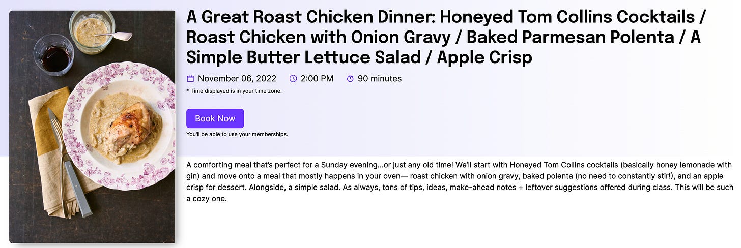 A comforting meal that’s perfect for a Sunday evening…or just any old time! We’ll start with Honeyed Tom Collins cocktails (basically honey lemonade with gin) and move onto a meal that mostly happens in your oven— roast chicken with onion gravy, baked polenta (no need to constantly stir!), and an apple crisp for dessert. Alongside, a simple salad. As always, tons of tips, ideas, make-ahead notes + leftover suggestions offered during class. This will be such a cozy one.