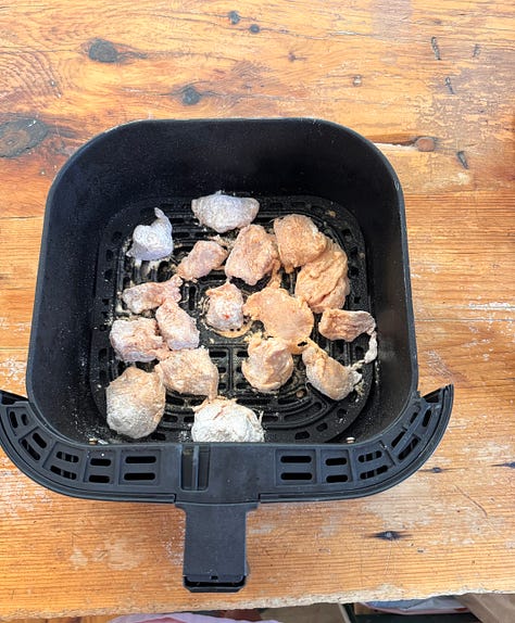 After shaking the chicken with the flour mixture, I lay it in my air fryer basket, give it a good spritz of cooking spray and let the pieces air fry until browned and crisp.