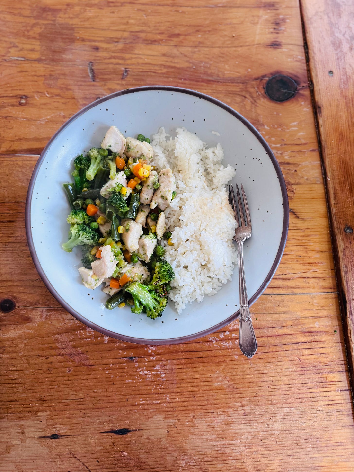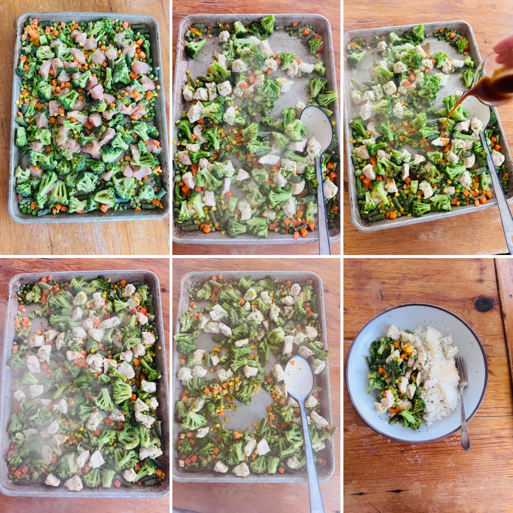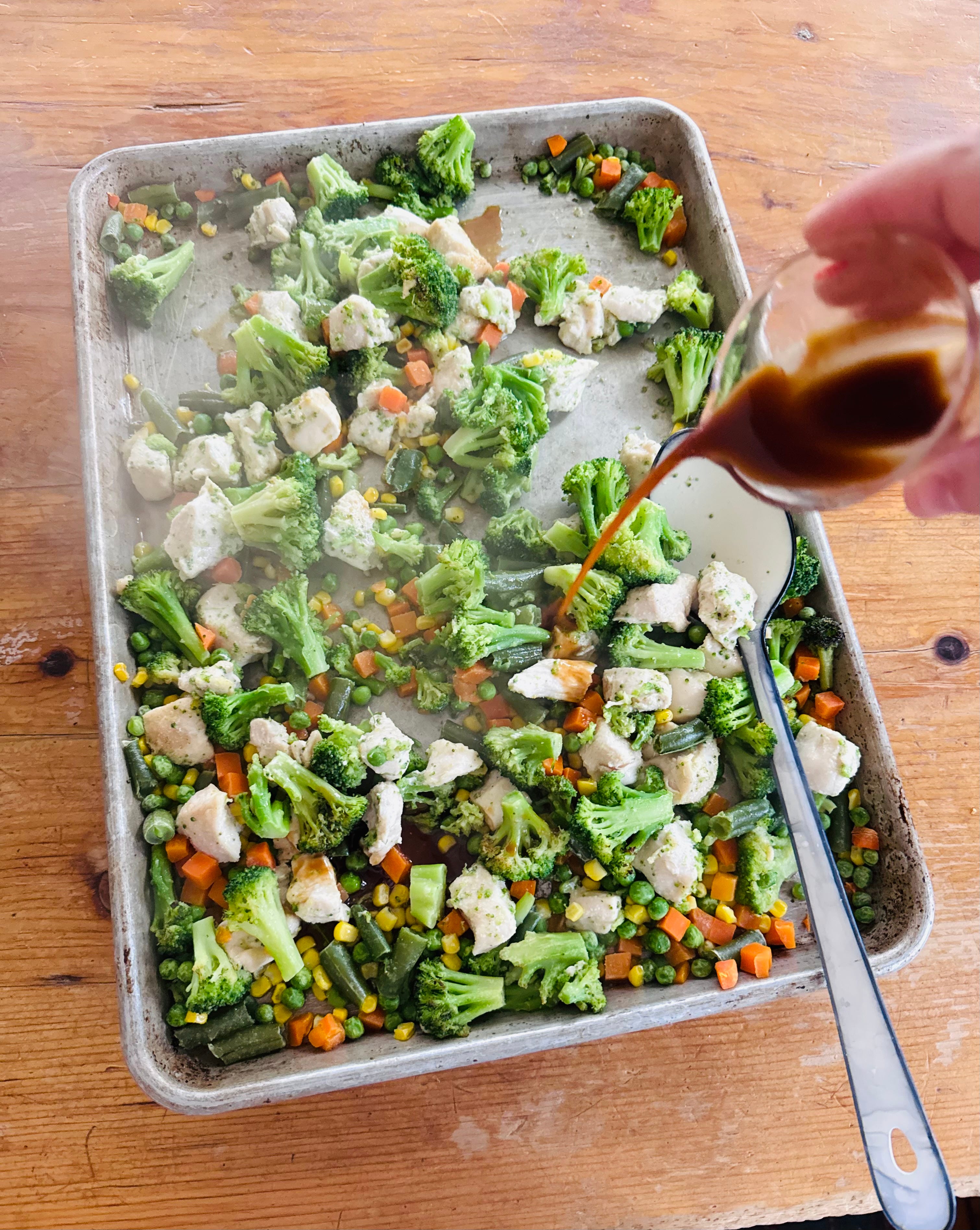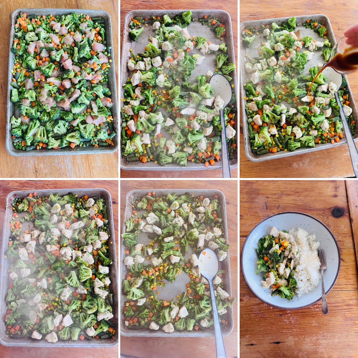 It’s chicken and a bunch of frozen vegetables cooked together on a sheet pan in a hot oven, drizzled with a simple sauce (basically equal parts soy sauce and something sweet like honey, a little fish sauce, and a little cornstarch), and then finished for a little extra time in the oven so the sauce thickens a bit. Serve it over rice and call it a day. It’s got the vibe of a stir-fry but is just easier all around.