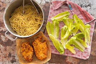 march 3 x 3: chicken cutlets, spaghetti + romaine lettuce
