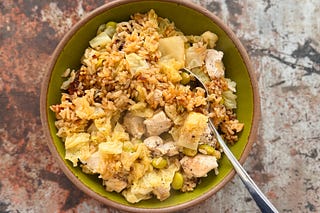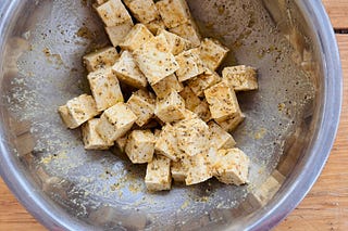 feb 3 x 3: rice noodles, crunchy crumbled tofu, roasted mushrooms
